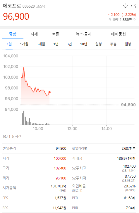 현재 에코프로 주가는 약 97,000원대,