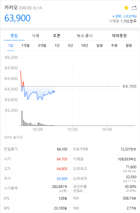 2025년 11월 12일 기준 카카오 주가는 63,700원이다.